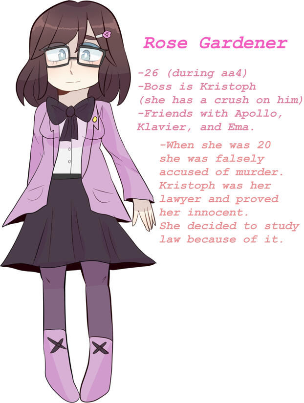 When she was 20 she was falsely accused of murder. Her lawyer was Kristoph and he proved her innocence. She decided to study law because of that. She now works under Kristoph and hes her mentor. She has a crush on him.